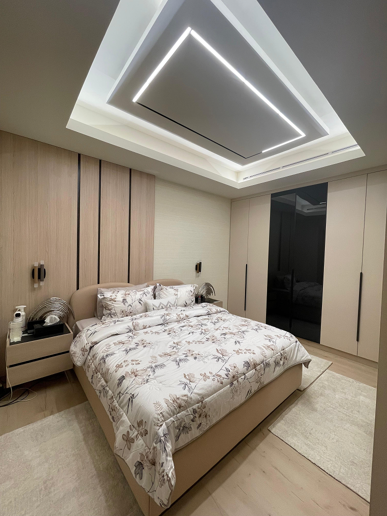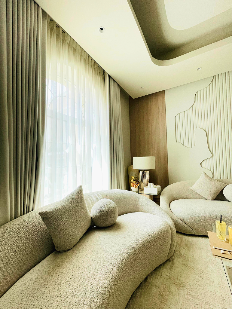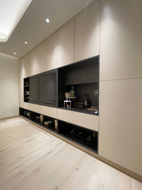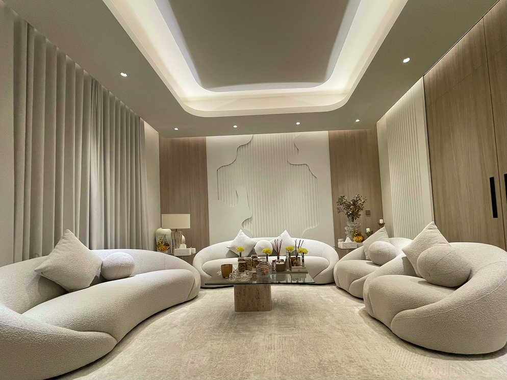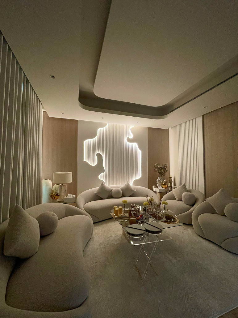 This project exudes contemporary elegance with its minimalistic design and calming neutral tones. Soft, sculptural furniture pieces create a serene atmosphere, enhanced by clever lighting features that add a sense of warmth and sophistication. The design focuses on clean lines and functional aesthetics, seamlessly combining comfort with modern luxury. The use of soft textures, such as plush seating and smooth cabinetry, complements the overall cohesive and inviting environment, making it an ideal space for both relaxation and intimate gatherings.