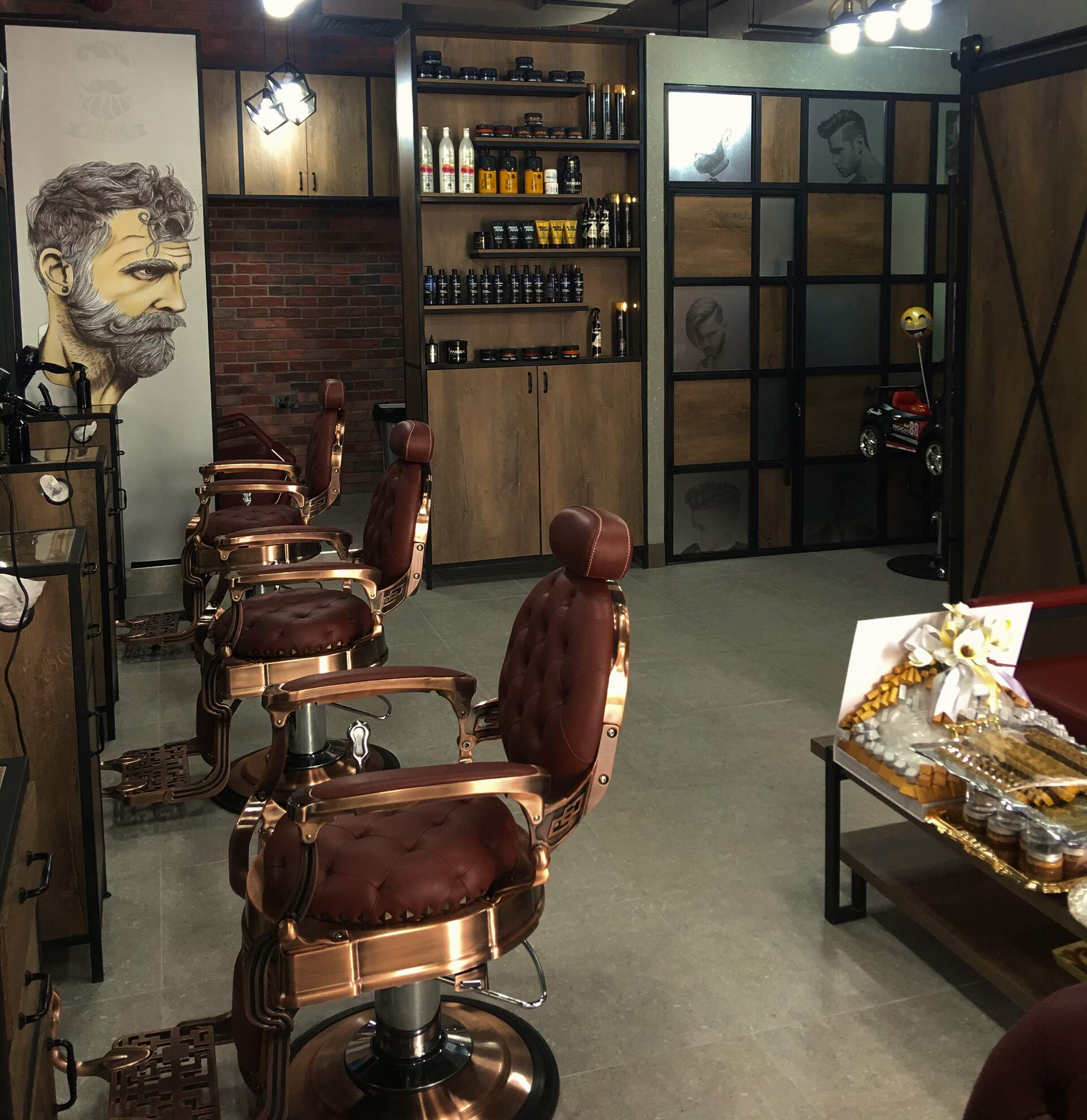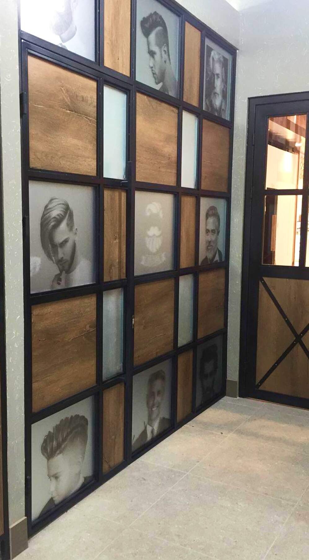 This barber shop project combines industrial design with modern aesthetics. The interior features rich wooden shelving, showcasing high-end hair products, while the exposed brick walls add a raw, urban feel. The stylish vintage barber chairs in copper tones complement the bold design, making the space both functional and trendy. Thoughtful lighting highlights the décor, while graphic prints and wall art create a lively, contemporary atmosphere, perfect for a premium grooming experience.