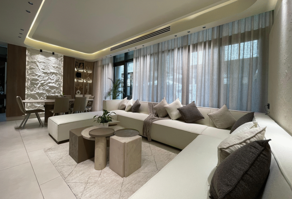 This project combines modern minimalism with cozy luxury. It features sleek furniture, open shelving, and neutral tones, accented by pops of color for a dynamic look. Natural light fills the space, highlighting elegant textures and stylish décor. The design creates a calm, functional, and inviting atmosphere perfect for both work and relaxation.